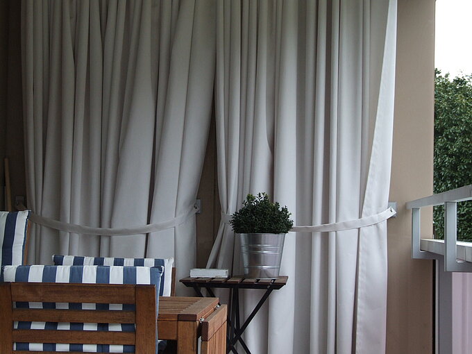 Dank ihres wetterbeständigen Outdoor-Stoffes sind Balkonvorhänge bis zu einem gewissen Grad auch dafür geeignet, Ihren Balkon, Ihre Terrasse oder Loggia vor Regen, Wind und anderen Witterungseinflüssen zu schützen. Bitte beachten Sie jedoch, dass ein abgespannter Behang im Wind wie ein Segel wirkt und bei zu grossen Kräften beschädigt werden kann. Ein ungesicherter bzw. losgerissener Behang kann Gegenstände beschädigen oder Personen verletzen und ist bei aufkommendem Wind einzufahren und zu sichern.