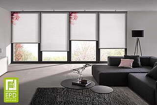 Rollos mit seitlichem Kettenzuggetriebe, Soft-System oder Elektroantrieb, Kassetten-Rollos und Verdunkelungsrollos.