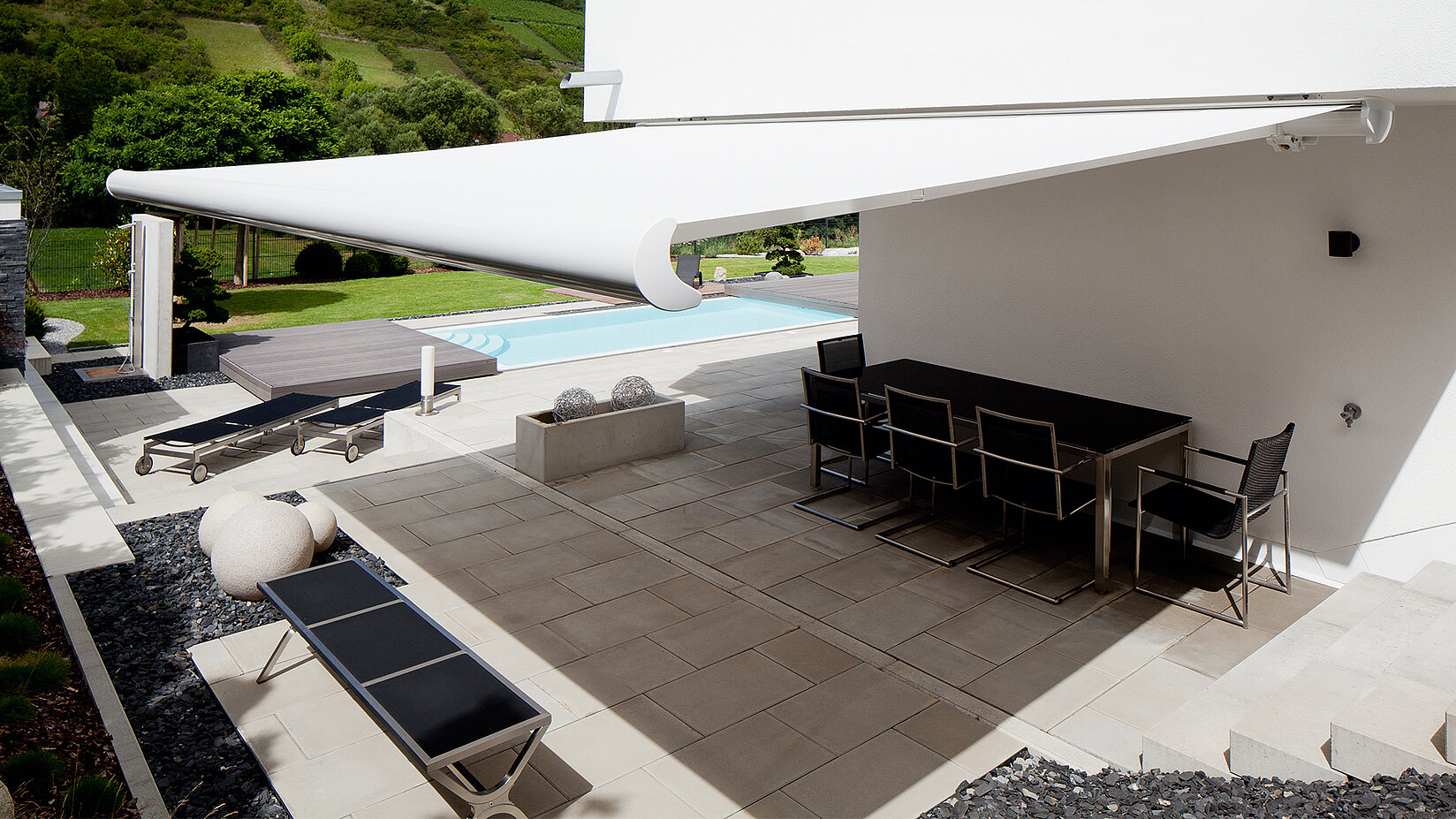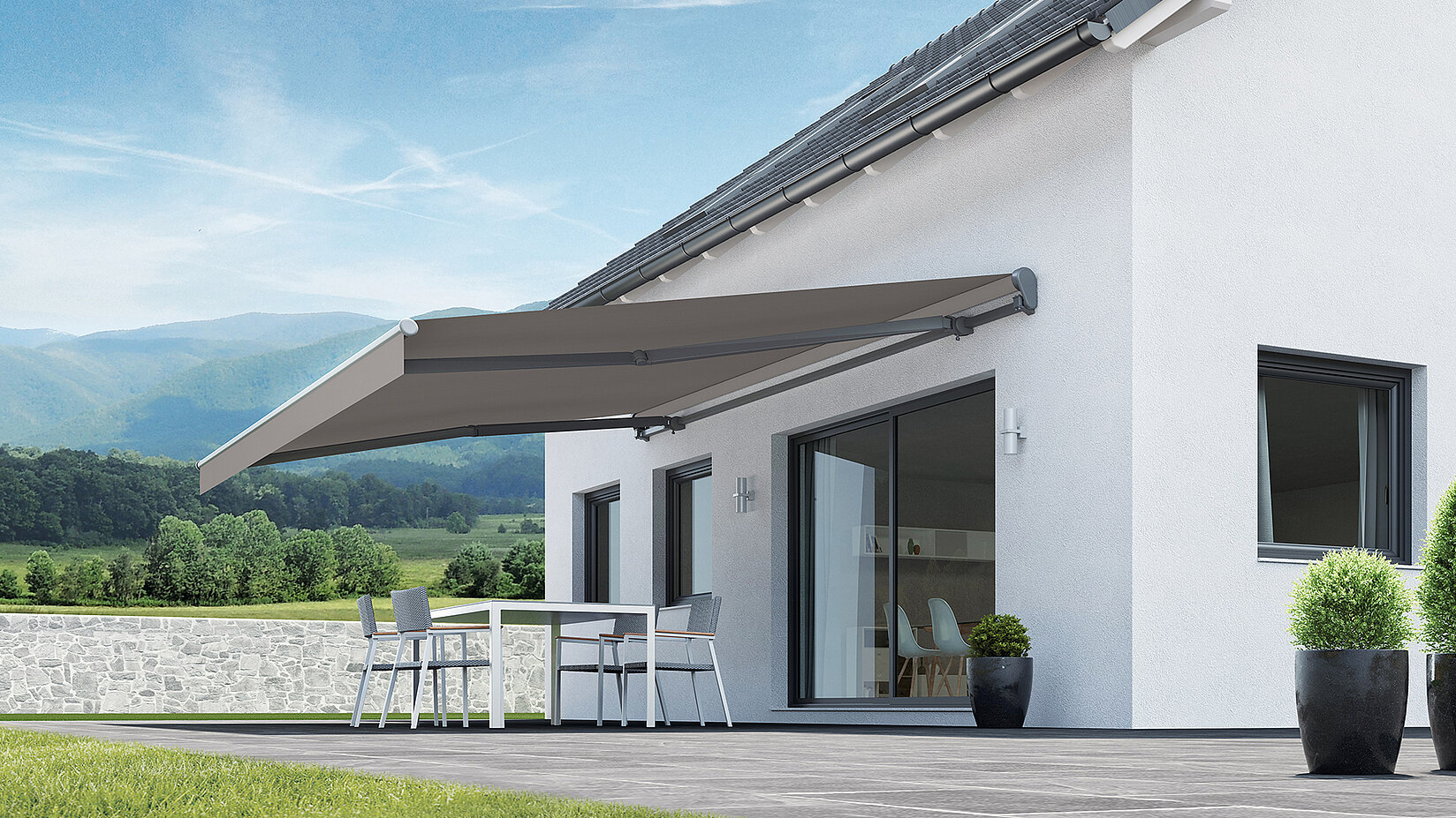 Graue Gelenkarmmarkise über minimalistisch möblierter Dachterrasse mit Blick ins Tal.