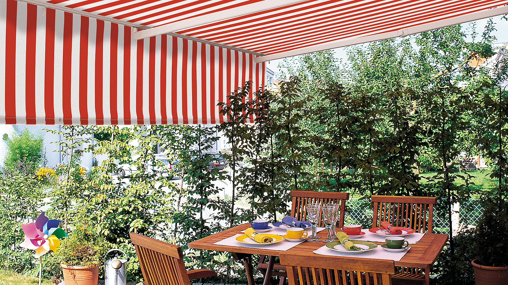 [Translate to Deutsch - CH:] rot weiss gestreifte Tragrohrmarkise Classic mit gedecktem Tisch