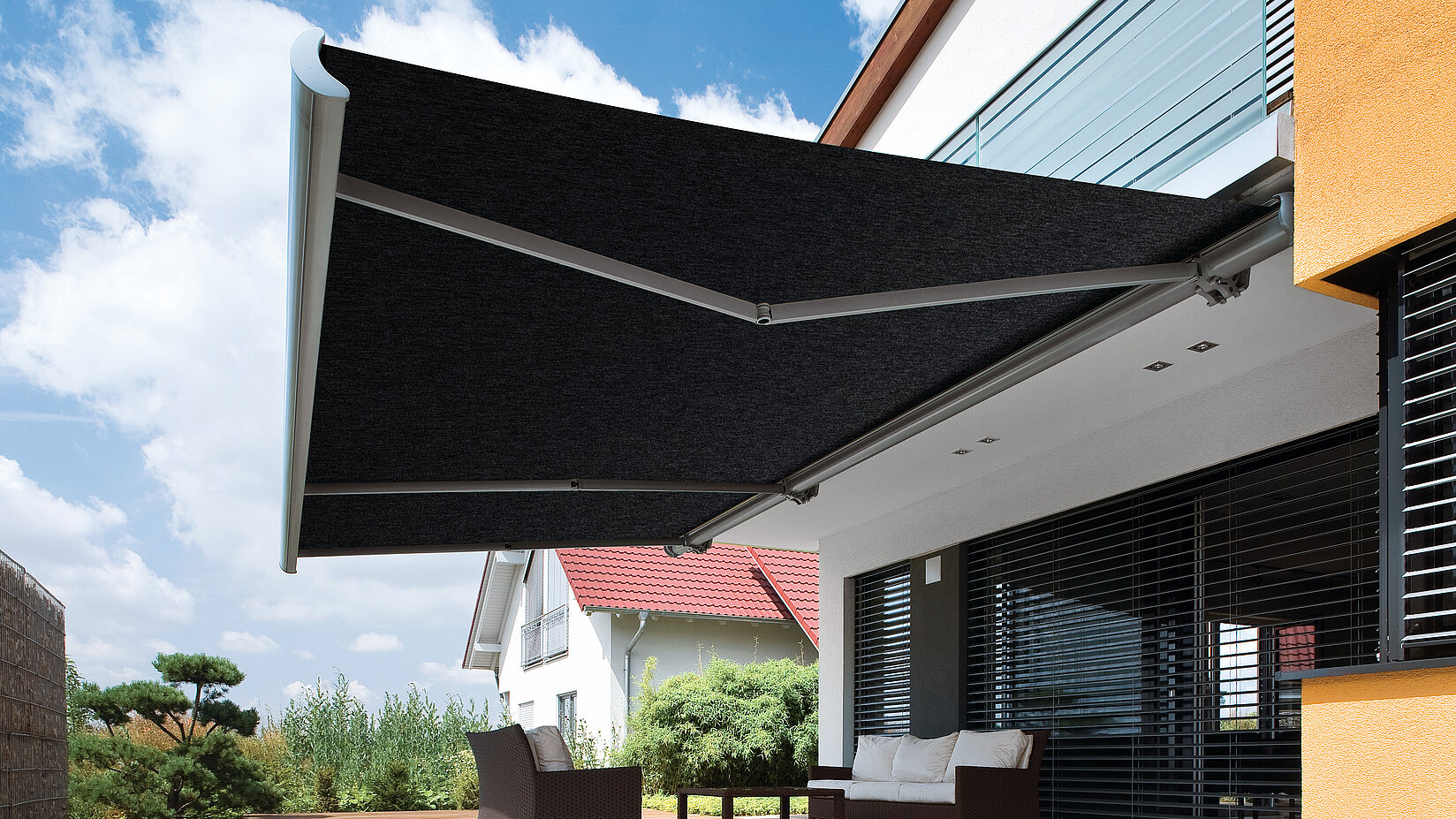 Anthrazitfarbene Gelenkarmmarkise über Terrasse mit Sitzgruppe an einem modernen Wohnhaus.