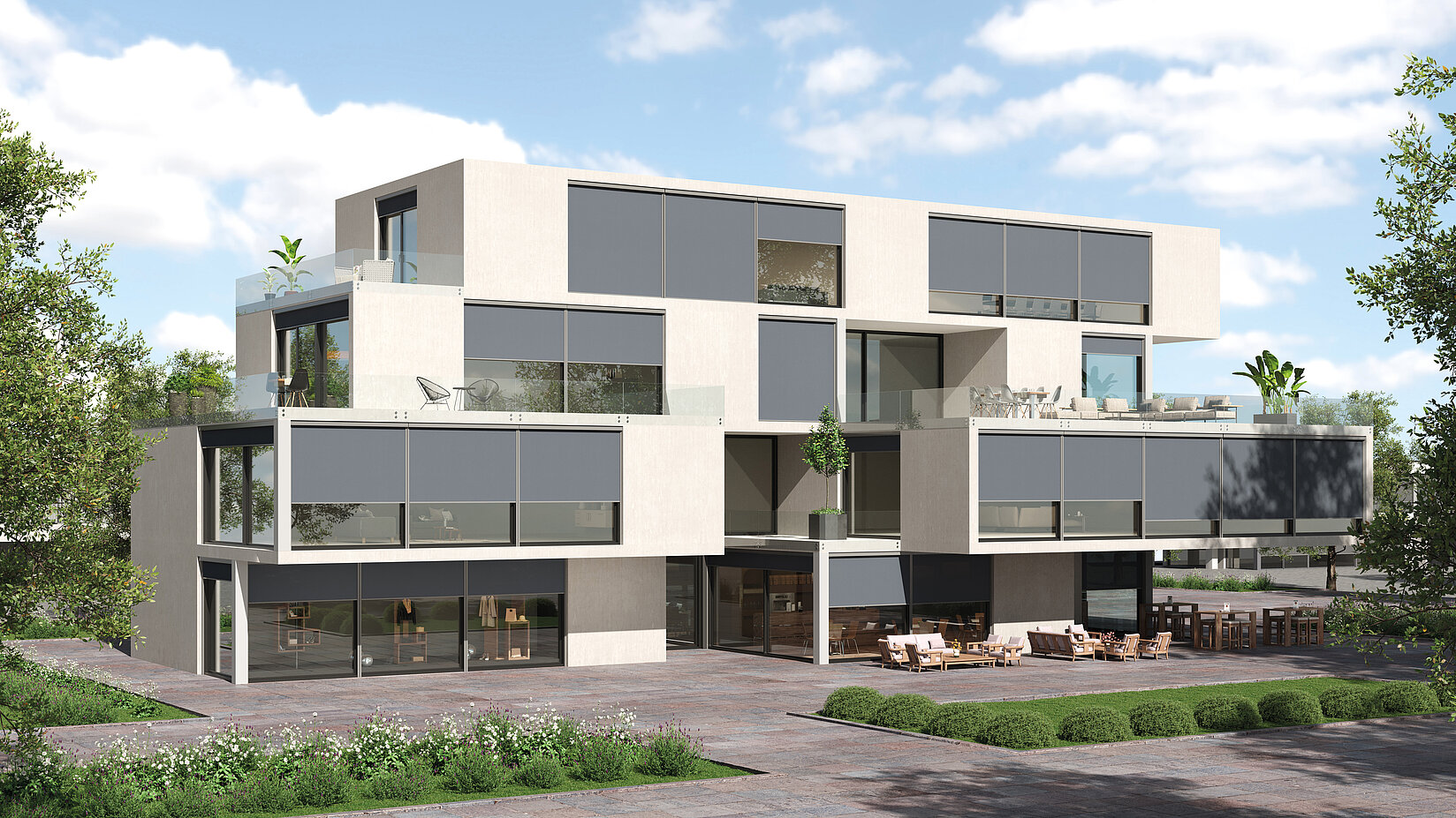 Die kubische Gestaltung gibt der zip_2.0 und zip 6 einen schlichten und zugleich exklusiven Charakter, so fügt sie sich dezent in jede Fassadengestaltung ein. Die Senkrechtmarkise ist eine designorientierte und qualitativ hochwertige Alternative zu Aussenraffstores, ihr textiles Material garantiert ein ausgesprochen wohnliches Design.