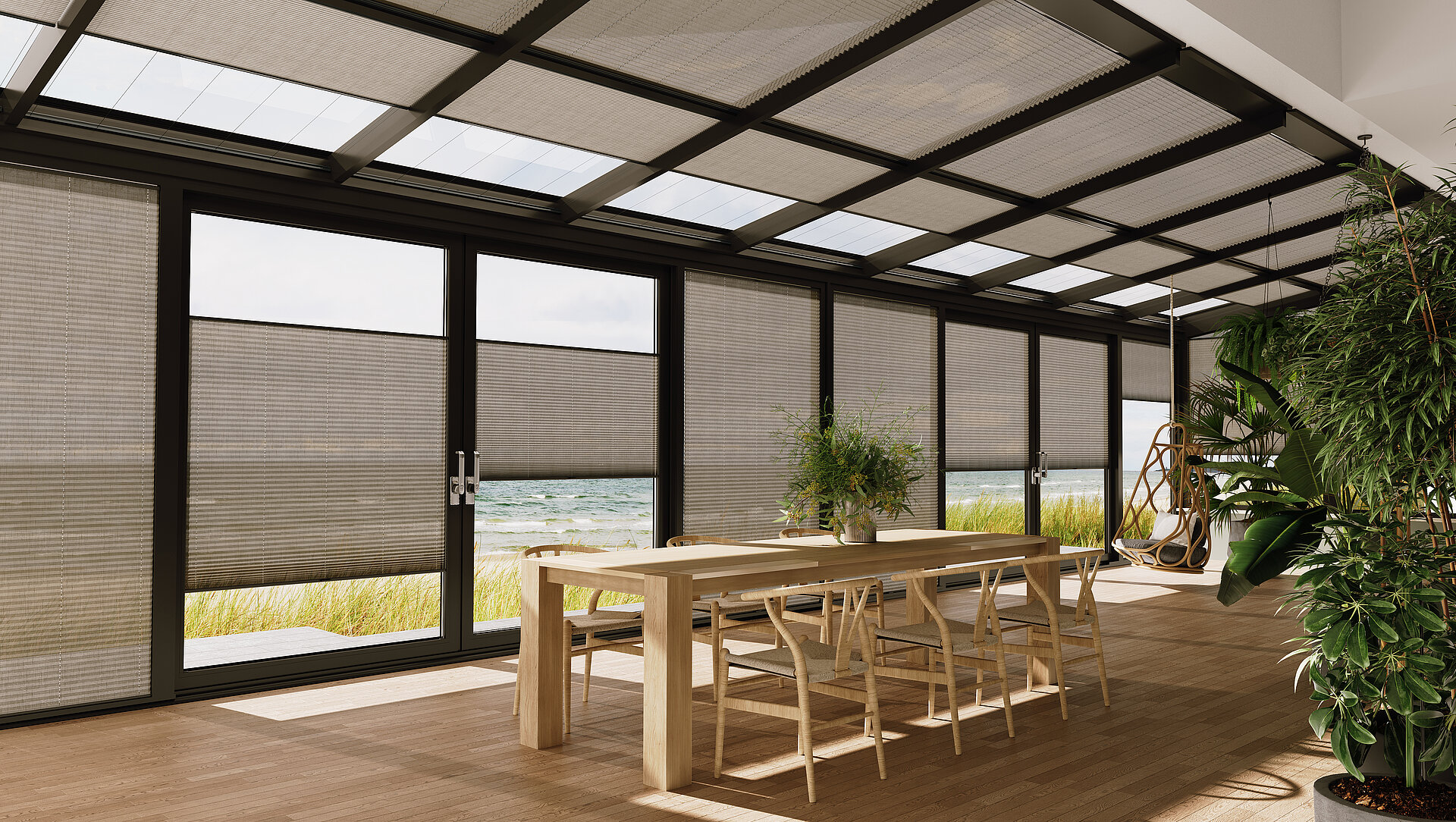 - Verwendung desselben Stoffs an den waagerechten und senkrechten Glasflächen des Wintergartens für eine einheitliche Optik