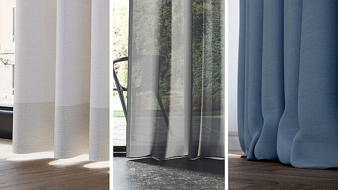 - Eine Vielzahl an Gardinenstoffen – von blickdicht über halbtransparent bis transparent