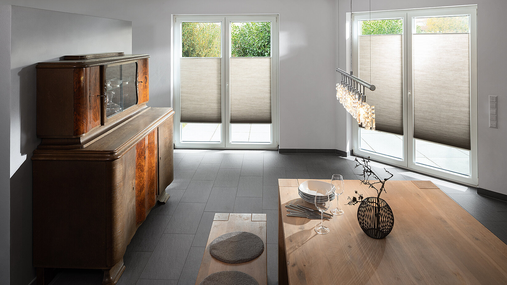Moderner Essbereich mit grauen Wabenplissees an bodentiefen Fenstern