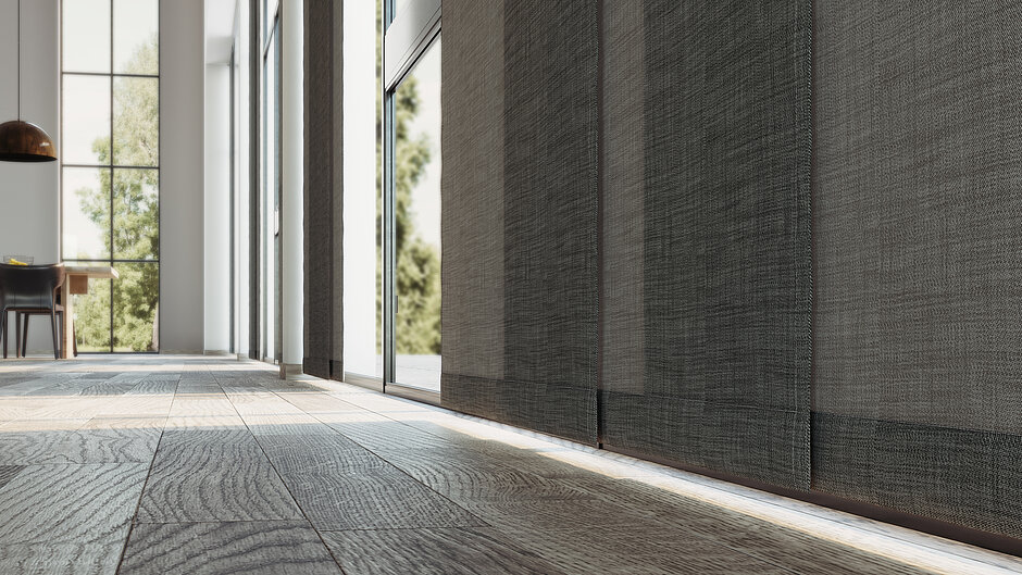 MHZ Dimout-Funktionsstoffe blenden das Tageslicht im Bedarfsfall zuverlässig ab. Ihre rückseitige Beschichtung reflektiert sowohl Sonnenstrahlen als auch Wärme und ermöglicht ein blendfreies Arbeiten. Bei der Auswahl des Stoffes gilt: Je niedriger der Transmissionswert des Gewebes, desto effektiver der Blendschutz.