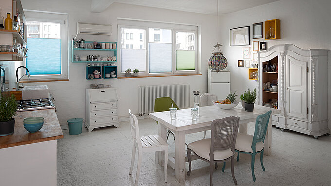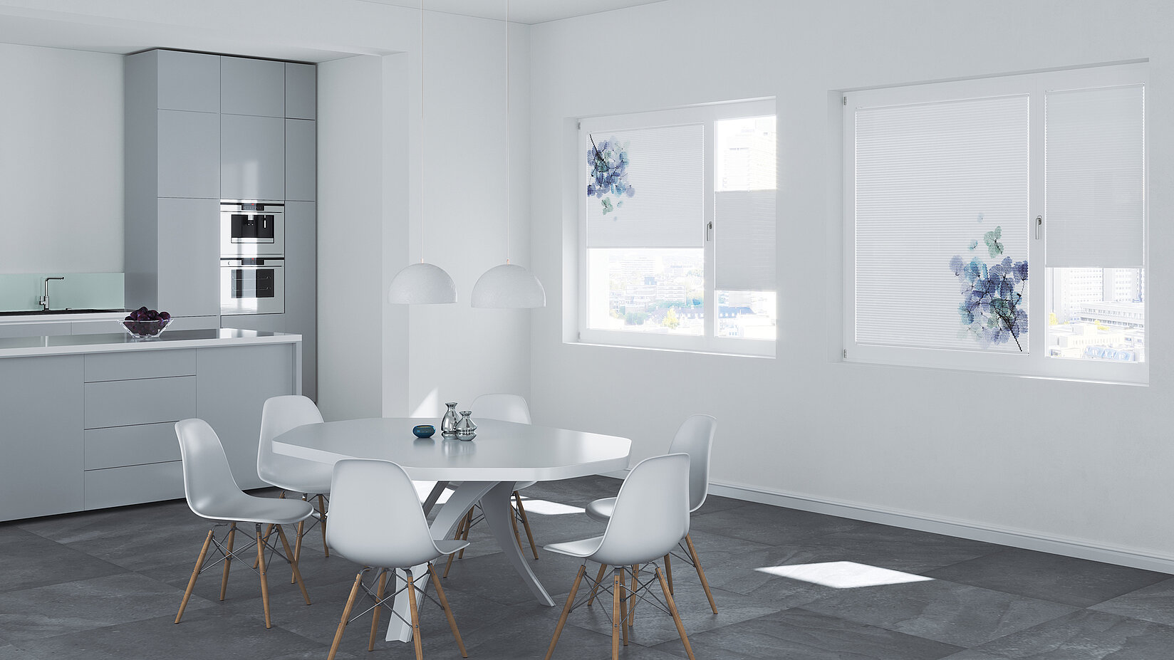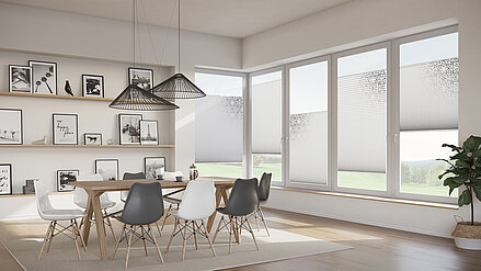 Die ausgeklügelte Technik und die hochwertigen DUETTE®-Stoffe verleihen Ihren Räumen eine edle und elegante Atmosphäre. Durch die Wabenstruktur und das einheitliche Faltenbild dringt das Licht gleichmässig ein. Passend zu Ihrem persönlichen Einrichtungsstil liefern die Wabenplissees das besondere Extra: fröhlich-farbenfroh, elegant-farbreduziert oder mit grossformatigen Motiven.