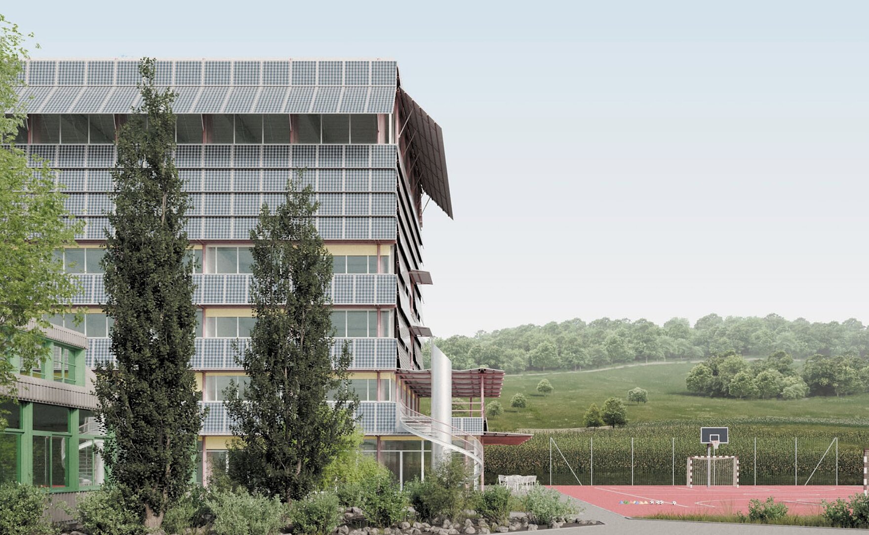 Beim Schulhaus in Visp nimmt dieser Anspruch unter anderem die Form zweier aussenliegender Türme an: Der «Biotopturm», eine Aussentreppe mit übergrossen Podesten auf der einen Gebäudeseite, ermöglicht Gruppenunterricht in den Baumkronen. Der «Wintergartenturm» auf der anderen Gebäudeseite verspricht angewandten Naturkundeunterricht, in dessen Rahmen Schulkinder Regenwasser sammeln oder Pflanzen ziehen und auf diese Weise Naturkreisläufe beobachten und verstehen lernen.