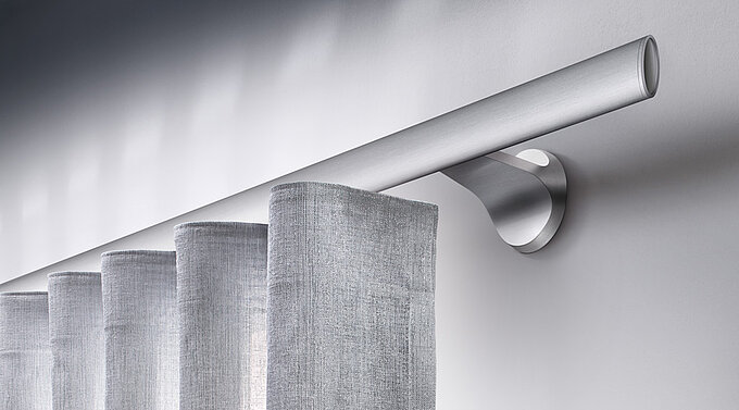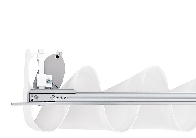 Pour les rideaux en une seule partie, la forme spéciale du chariot de guidage permet de faire en sorte qu’il passe sous le galet de renvoi jusqu’à l’extrémité de l’installation. Une variante particulièrement esthétique pour les systèmes avec butée murale, puisque le rideau arrive jusqu’au mur sans laisser d’espace.