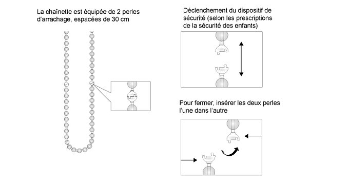La sécurité de vos enfants est une priorité absolue à nos yeux. Afin de réduire au minimum le risque d’accident avec des cordons, des chaînettes ou des sangles lors de l’utilisation de revêtements de fenêtres, un dispositif de sécurité est intégré dans les chaînettes de manœuvre et les cordons de tirage MHZ, et s’ouvre en cas de pression excessive. Cela permet d’empêcher que les enfants en bas-âge ne soient accidentellement empêtrés dans des boucles dangereuses qui risqueraient de les étrangler. Il est néanmoins conseillé de tenir les cordons hors de portée des enfants et de ne pas relier les cordons entre eux. Les lits, les lits pour enfants et les meubles doivent être installés à l’écart des cordons des revêtements de fenêtres.