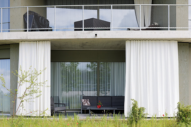 Altro dettaglio non secondario che sottolinea le particolarità del fabbricato è l'installazione di 72 binari per tende MHZ, 60 dei quali si adattano alla forma curva dell'edificio, e di 116 tende da balcone di alta qualità MHZ "Soft-Screen bianco". Con una larghezza di 4000 mm e un'altezza di 3000 mm, le tende sono resistenti alle intemperie e proteggono il balcone, la veranda, la terrazza o la loggia dal sole e dal calore. Oltre a ciò, schermano i dannosi raggi UV e contribuiscono a mantenere gradevole la temperatura, bloccando la luce solare e il calore. Il balcone si mantiene quindi più fresco, mentre l'aria può circolare. Le tende per esterni MHZ rappresentano inoltre un elemento di design per i balconi e le facciate e valorizzano con discrezione la struttura peculiare dell'edificio. Non da ultimo, offrono ulteriore comfort come protezione dal vento e dalla pioggia e tengono lontani gli sguardi indiscreti, affinché il balcone rimanga un'oasi di benessere indisturbato. Se inutilizzate, le tende possono essere richiuse in modo rapido e sicuro con nastri di fissaggio. Oltre alla lavorazione di alta qualità e all'estetica moderna, le tende da balcone MHZ si fanno notare per la guida pieghevole, facilmente adattabile alle condizioni strutturali. I robusti carrelli dotati di rotelle di scorrimento in alluminio agevolano l'utilizzo, mentre la vasta scelta di colori offre ampia libertà creativa. L'installazione di questi elementi nel progetto "Rondo" è stata eseguita a regola d'arte da Huber Montage Service GmbH.