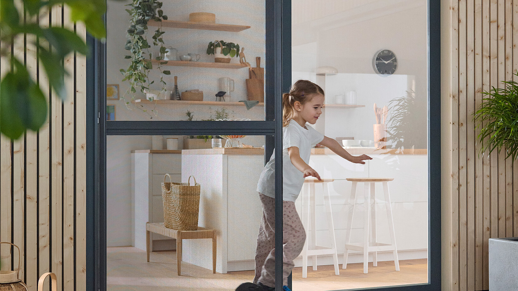 I pannelli scorrevoli assicurano un accesso senza ostacoli a balconi e terrazze e conquistano per la loro semplicità d'uso. Su richiesta, vengono realizzati anche con chiudiporta automatici. La zanzariera può scorrere per trovarsi sempre dove serve. Grandi superfici in tessuto contigue offrono una visuale perfetta verso l'esterno, creando così ambienti abitativi unici.