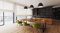 Inoltre, è possibile configurare processi individuali e condizioni intelligenti, ad esempio una simulazione smart che apre e chiude automaticamente la protezione visiva e solare mentre siete in vacanza. Grazie alle tapparelle motorizzate e ai sensori meteorologici, potrete evitare facilmente il surriscaldamento degli ambienti in estate e risparmiare contemporaneamente energia in inverno.