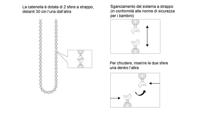 Doppio vantaggio: il sistema a strappo integrato è di serie per tutte le tende e se la catena si “strappa” può essere ripristinata con semplicità.